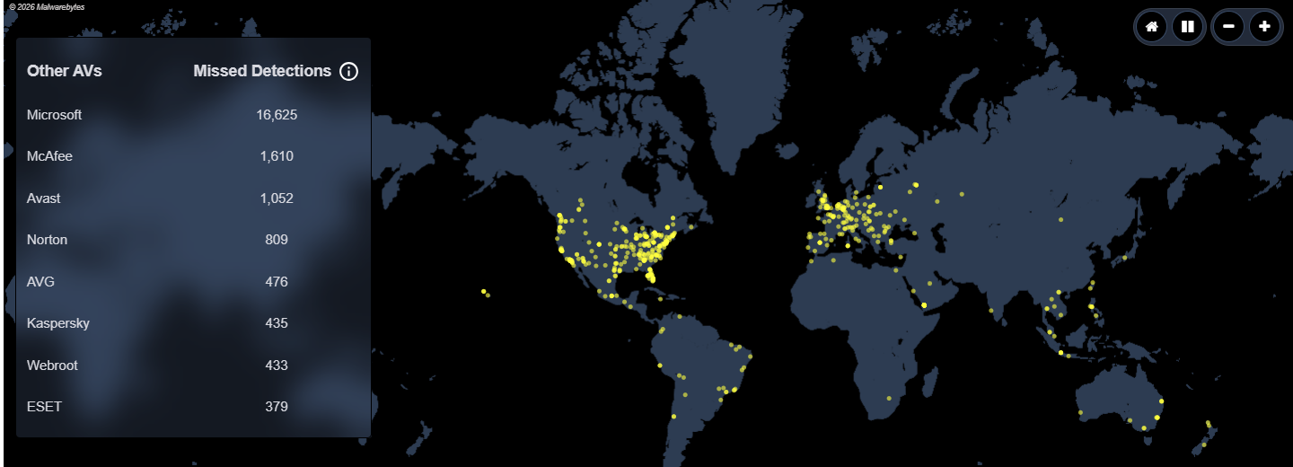 Malwarebytes ofrece un recurso visual llamado Mapa de Saneamiento, donde se pueden observar estadísticas globales de amenazas detectadas y dispositivos remediados en tiempo real.